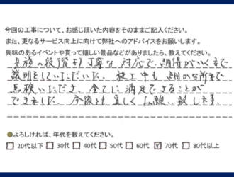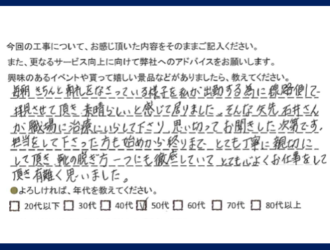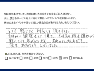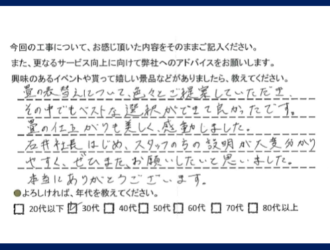 今まで関わった大切な3万件のお客様の声 施工カテゴリー 襖 畳 施工エリア 石岡市 かすみがうら市 小美玉市 土浦市 丁寧な対応で納得がいくまで説明をしていただいた 土浦市 T様 詳しくはこちら 畳の仕上がりも美しく感動しました 小美玉市 N様 詳しくはこちら 畳の表替えについてご提案していただきベストな選択ができてよかった 石岡市 K様 詳しくはこちら ふすまの開け閉めが軽くなりよかったです 土浦市 詳しくはこちら とても丁寧に親切にして頂き、心よくお仕事をして頂き、有難く思いました。 小美玉市 N様 詳しくはこちら 担当の方はとても誠実な印象でした。 かすみがうら市 詳しくはこちら